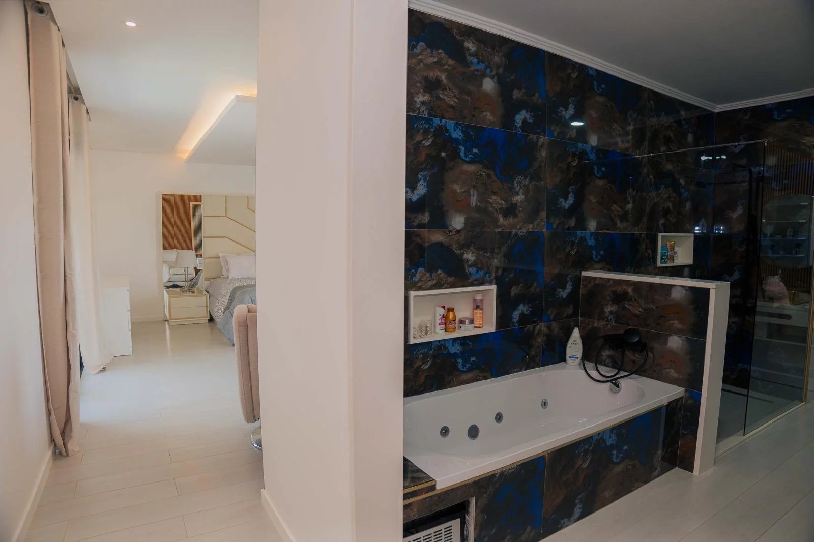 • 1 suíte completa com banheira de hidromassagem e com acesso a um amplo balcão com vista para a piscina e para o mar